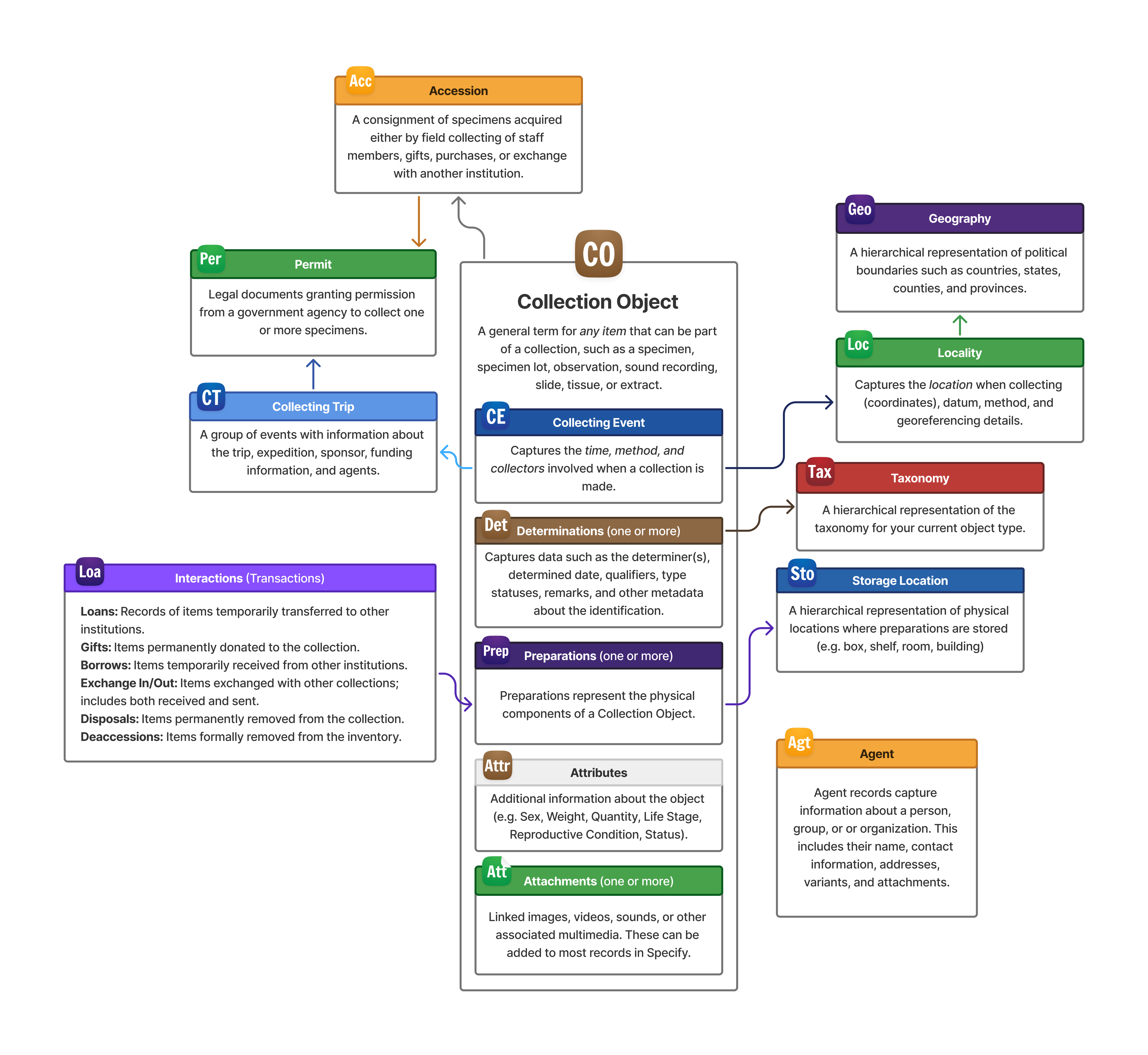 The Beaty’s main databasing system is Specify 7, a relational database developed for natural history museums. Relational databases are use an object-oriented metaphor, where the rows of the tables (think Excel table) in the database represent objects (whether physical or abstract) and the columns represent attributes of those objects. This object-oriented metaphor explains the database schema choices that the Specify 7 developers have made, but it also produces benefits and drawbacks for people who are trying to record and find data.